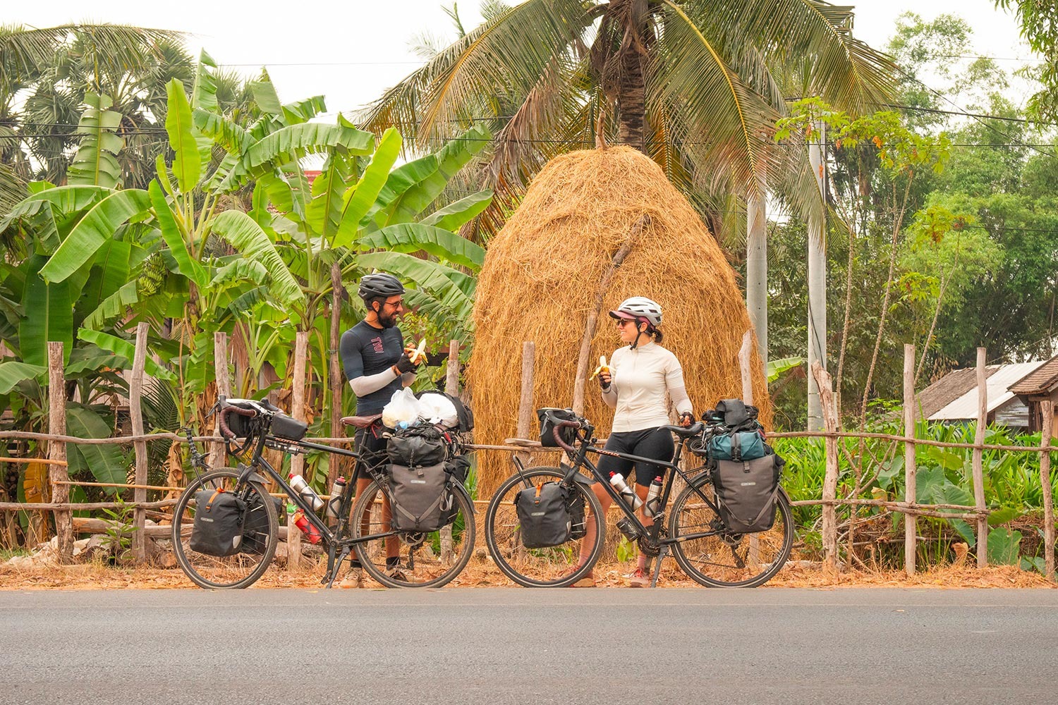 Fiona et Bryan. Nous roulons sur des vélos solides en acier, des Kona Sutra. L’acier, c’est un peu le matériau parfait pour le voyage : robuste, confortable grâce à sa souplesse (il absorbe bien mieux les irrégularités qu’un cadre en aluminium une fois chargé), et surtout réparable partout dans le monde, car il se ressoude facilement aux quatre coins de la planète.Tout notre équipement a été choisi avec la même logique : privilégier la fiabilité et la facilité à trouver des pièces de rechange en route, tout en supportant le poids conséquent de nos sacoches (jusqu’à 55 kilos chacun !).