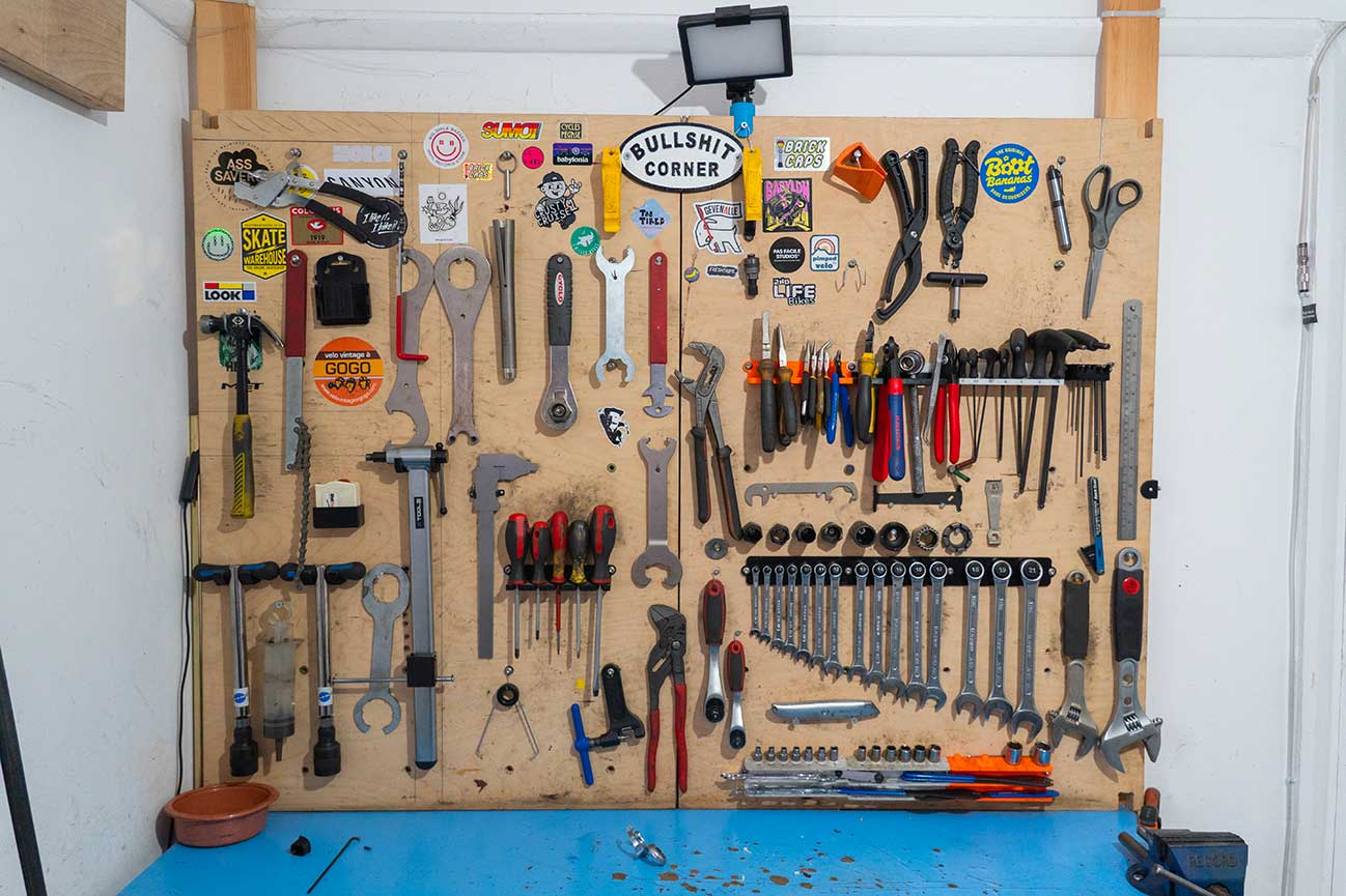 Pierre-Félix. Mon atelier est très petit. J’ai eu la chance de commencer dans un garage, mais actuellement c’est une petite pièce à l’intérieur de mon appartement. Vivre dans un appartement est un petit défi, surtout lorsqu’on fait entrer et sortir des vélos. Cela a nécessité quelques aménagements pour ne pas abîmer l’espace (les tapis en mousse ont été une grande amélioration, par exemple). Mais j’adore le fait que l’atelier fasse partie intégrante de l’appartement, ce qui me permet d’y accéder à tout moment. Je passe beaucoup de temps à concevoir quelques solutions sur mesure pour le rendre plus pratique. Par exemple, j’utilise des caisses Royal Mail trouvées dans la rue pour organiser mes pièces et j’ai fabriqué un panneau perforé et des étagères avec un ami pour avoir plus de rangement.