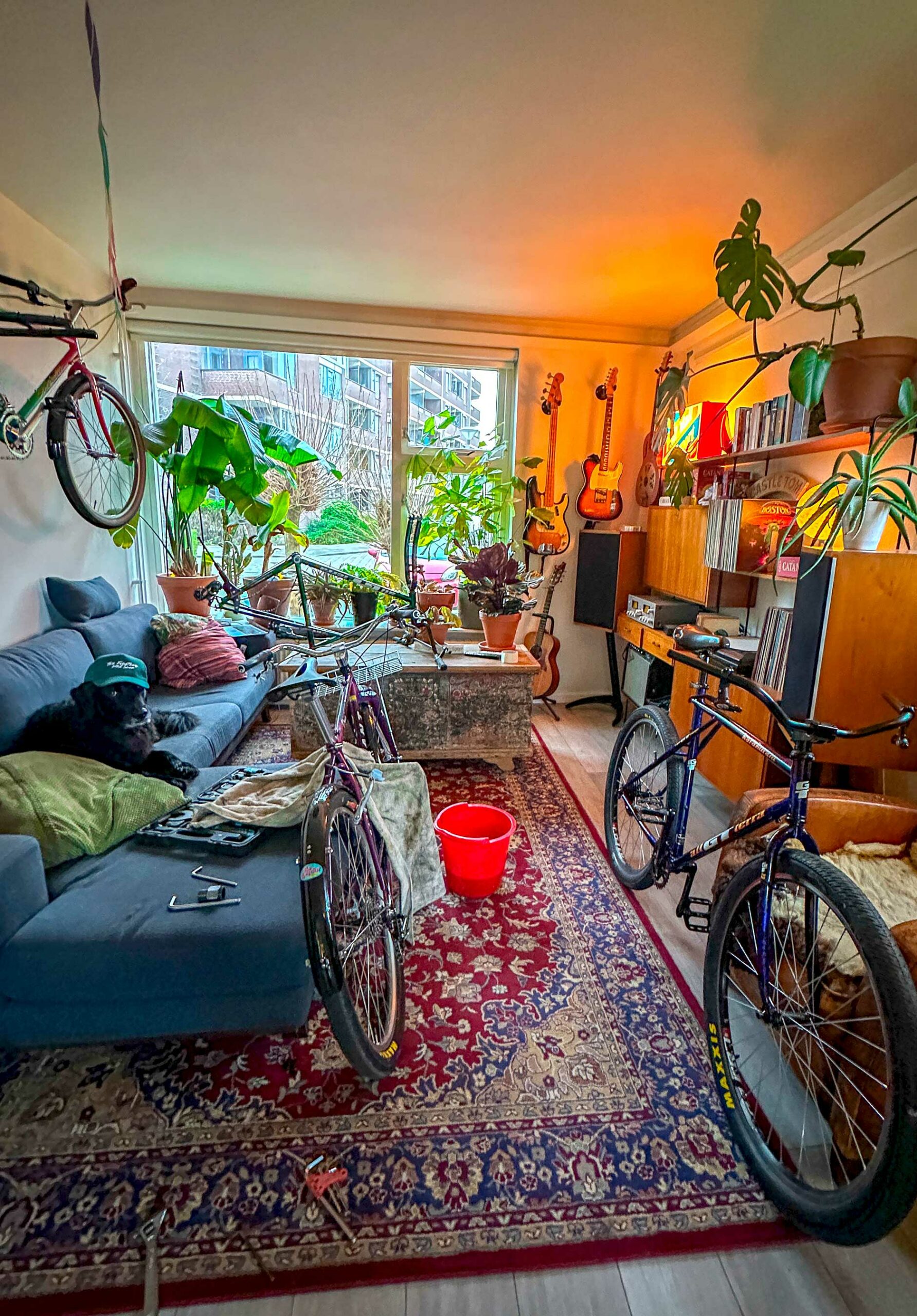 Je fais du vélo tous les jours parce que je vis aux Pays-Bas, et même si je ne suis pas néerlandais, j’ai beaucoup trop de vélos à moi. Celui que j’utilise le plus est un « bakfiets », un vélo cargo un peu moche et rouillé, orange, pour transporter Norman. À côté de ça, j’ai un Specialized Hardrock rose de 1991, un Rockhopper de 1989 et un Stumpjumper de 1989, un GT Timberline de 1994, un Karakorkam de 1993 (en cours de restauration) et un Giant Escaper de 1989. Mon préféré est probablement ce dernier, simplement parce qu’il s’est assemblé de façon vraiment réussie. Bien qu’il soit un peu trop flashy pour certains, je trouve que le cadenas de roue rose et le porte-bagages multicolore Manivelle le rendent vraiment unique.